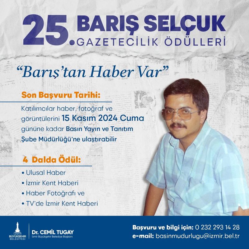 İzmir Büyükşehir Belediyesi’nin 25 yıldır düzenlediği Barış Selçuk Gazetecilik Ödülleri’nde bu yıl da büyük heyecan yaşanacak. Türk basınının en prestijli ödülleri arasındaki yarışmanın son başvuru tarihi ise 15 Kasım.