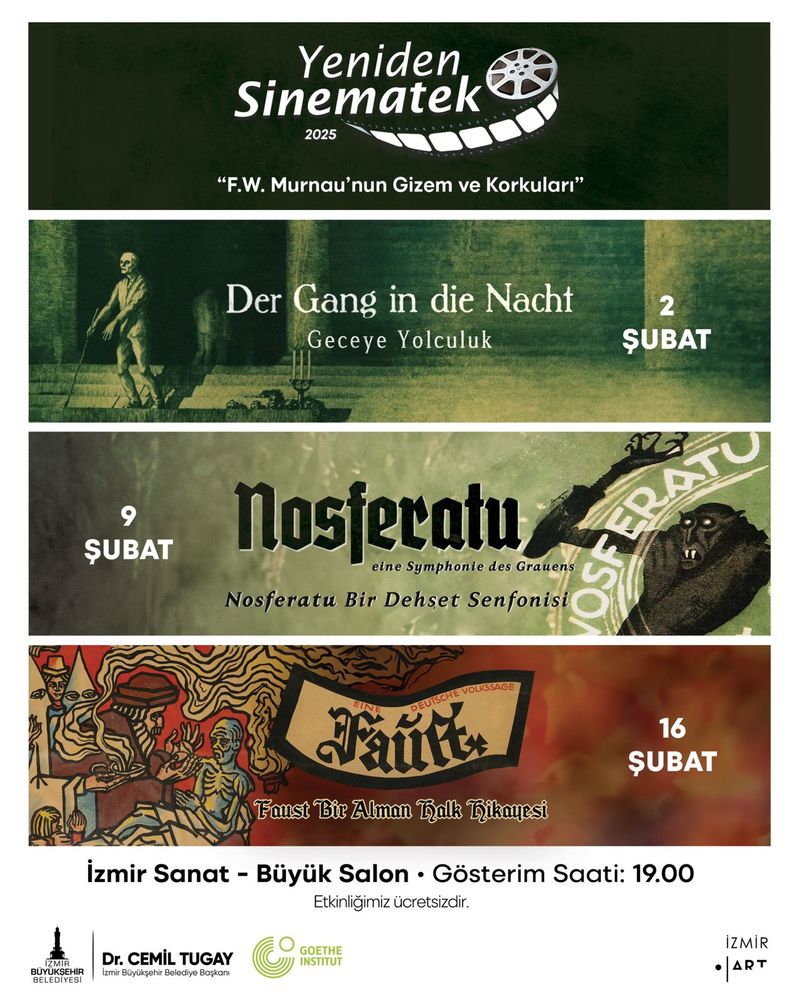 Yeniden Sinematek, şubat ayında Goethe Institut iş birliği ile “F.W. Murnau’nun Gizem ve Korkuları” temasıyla sinemaseverlerle buluşmaya hazırlanıyor. Seçkide dışavurumculuk akımının Alman sinemasındaki en önemli temsilcilerinden olan F. W. Murnau’nun birbirinden etkileyici eserleri yer alıyor. Ücretsiz film gösterimleri, 2 Şubat Pazar günü “Geceye Yolculuk” ile başlayacak. 9 Şubat Pazar günü ise “Nosferatu, Bir Dehşet Senfonisi” gösterilecek. Seçkinin son filmi ise “Faust Bir Alman Halk Hikâyesi” olacak. Film, 16 Şubat Pazar günü izleyicilerle buluşacak. Tüm filmler İzmir Sanat Büyük Salon’da saat 19.00’da başlayacak.
