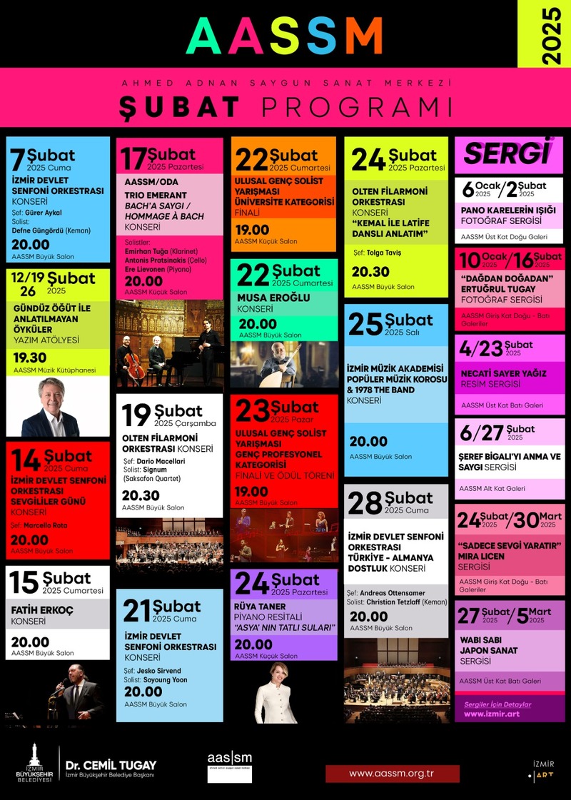 İzmirli sanatseverlerin adresi şubat ayında da AASSM olacak. 28 gün boyunca farklı kültür ve sanat etkinliklerine ev sahipliği yapacak merkez, İzmirlileri konser, sergi, yarışma ve atölyelerle buluşturacak. Fatih Erkoç, Musa Eroğlu, İzmir Devlet Senfoni Orkestrası, Olten Filarmoni Orkestrası gibi önemli konserlerin yanı sıra Ulusal Genç Solist Yarışması Üniversite Kategorisi Finali, Ulusal Genç Solist Yarışması Genç Profesyonel Kategorisi Finali ve Ödül Töreni, Gündüz Öğüt ile Anlatılmayan Öyküler Yazma Atölyesi ile çok sayıda sergi sanatseverleri çağırıyor.