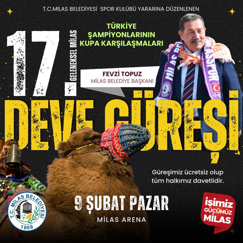 Pehlivan develerin heyecanlı güreşlerine sahne olması beklenen Milas Deve Güreşi Festivali’nin 17.sinin gerçekleştirileceğini belirten Milas Belediye Başkanı Fevzi Topuz “Tarihi ve kültürel değerlerimizin yaşatılması amacıyla gerçekleştireceğimiz güreşlerde ülkemizin farklı illerinden pehlivan develer boy gösterecek. Türkiye Şampiyonlarının kupa müsabakalarının da olacağı güreşler ücretsiz olarak vatandaşlarımızla buluşacak. 9 Şubat Pazar günü Milas Arena’da düzenlenecek olan güreşlere tüm vatandaşlarımızı davet ediyorum” dedi.
