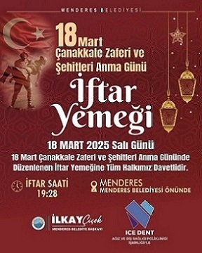 Menderes Belediyesi, 18 Mart Çanakkale Zaferi ve Şehitleri anma gününde şehitler anısına iftar yemeği verecek. Belediye önünde gerçekleşecek programa tüm halk davet edildi. 18 Mart Salı Günü’ne denk gelen iftarda oruç açma saatinin 19:28 olduğu hatırlatıldı.