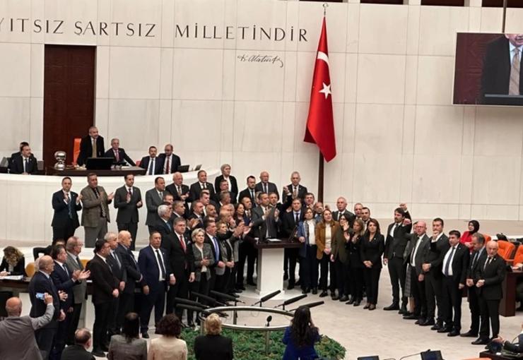 Ali Mahir Başarır'ın konuşması sırasında tüm CHP'li milletvekilleri de kürsüye çıktı. CHP'li vekillere, DEM Partili vekiller de alkışla ve zılgıt çekerek destek verdi.