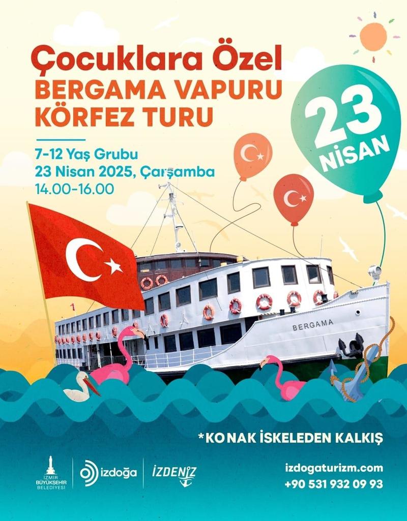 İzmirli çocuklar için İZDENİZ ve İZDOĞA tarafından çok özel bir etkinlik daha planlandı. Konak İskele’den kalkacak tarihi Bergama Vapuru, 23 Nisan’a özel çocuklar için Körfez turu yapacak. Etkinliğe 7-12 yaş arası çocuklar ebeveynleriyle katılabilecek. 14.00-16.00 saatleri arasındaki turda drama çalışması, Deniz İzcileri Atölyesi, Gemici Düğümleri ve Can Yeleği Giyme Atölyesi düzenlenecek. Bir yetişkin ve bir çocuğun katılımını kapsayacak turun biletleri için www.izdogaturizm.com adresi ziyaret edilebiliyor.