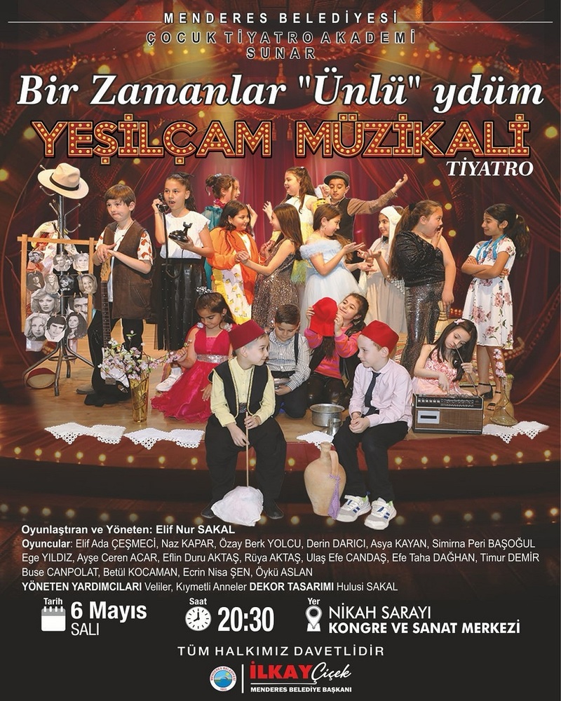 Menderes Belediyesi’nin bünyesinde yer alan çocuk tiyatrosu akademisi yeni oyununun prömiyeri ile tiyatro severlerin karşısına çıkıyor. ‘Bir Zamanlar “Ünlü”ydüm’ adlı Yeşilçam müzikal tiyatrosuna uzun bir süredir hazırlanan çocuklar 6 Mayıs Salı Saat 20:30’da Menderes Belediyesi Nikah ve Kongre Sarayı’nda oyunu ilk kez sergileyecek. Elif Nur Sakal yönetmenliğinde sahneye çıkan Çocuk Tiyatro Akademisi tüm vatandaşları oyunu izlemeye davet ediyor.