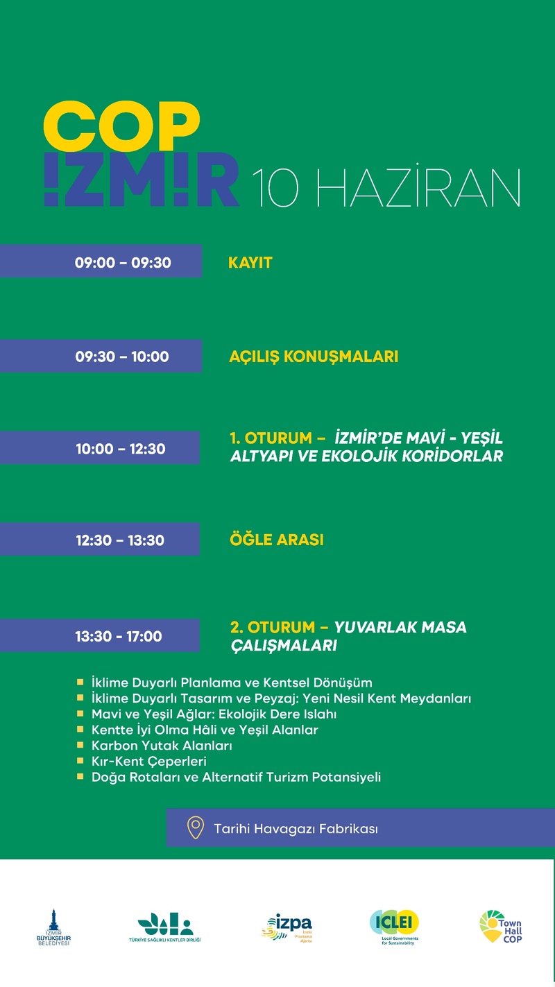 İzmir Büyükşehir Belediyesi, “tek sağlık” ve “iyi olma” yaklaşımları çerçevesinde Türkiye’de ilk kez yerel düzeyde bir COP organizasyonu olan COP İzmir serisine ev sahipliği yapmaya devam ediyor. Türkiye Sağlıklı Kentler Birliği İzmir Ofisi iş birliği ile gerçekleştirilen toplantıların bir sonraki durağı 10 Haziran’da Tarihi Havagazı Fabrikası olacak. “COP30’a Giderken Yerelden Küreseli Görmek - İzmir’in Geleceği: Yeşil Kuşaklar” başlıklı etkinlikte, sunum ve çok paydaşlı yuvarlak masa çalışmaları olacak.