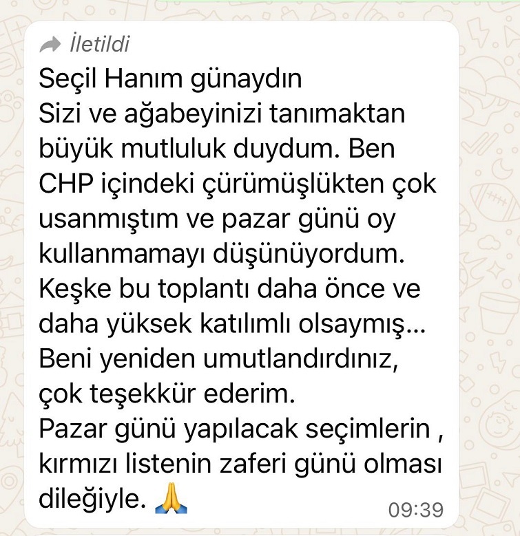 Av. Süleyman Karadağ bağımsız ve hür iradeleriyle partiye hizmet etmek istediklerini belirterek: “Bugüne kadar ilçe başkanları maalesef belediye yönetimlerinin işaret ettiği kişilerden seçildi. Delege ağaları ilçe başkanlarını belirledi. İlçe başkanlarının güç alacağı yer örgüttür. Ben ilçe başkanlığı adaylığımda kimseden icazet almadım. Ben gücümü partililerden alıyorum. Biz başından beri ilçe başkan adayımızı açıkladık. Fakat diğer listeler ilçe başkan adayını açıklayamıyorlar. Çünkü aday olmak isteyen hiçbir arkadaşım kendi iradesiyle aday olamıyor. Liste başlarının kendilerini işaret etmesini umut ederek bekliyorlar. Bu şekilde seçilecek ilçe başkanının Çiğli’ye ve CHP’ye hizmet edebilmesi mümkün değil. Yine de bize destek veren vermeyen tüm partililerimize teşekkür ediyoruz. Bugün başaracağımıza inanıyoruz. Fakat başaramasak da bu ilkelerimizden sapmadan mücadeleye devam edecek, bugün olmazsa yarın mutlaka başaracağız. Günün birinde tüm Çiğli’ye nasıl yönetilmesi gerektiğini göstereceğiz” dedi.