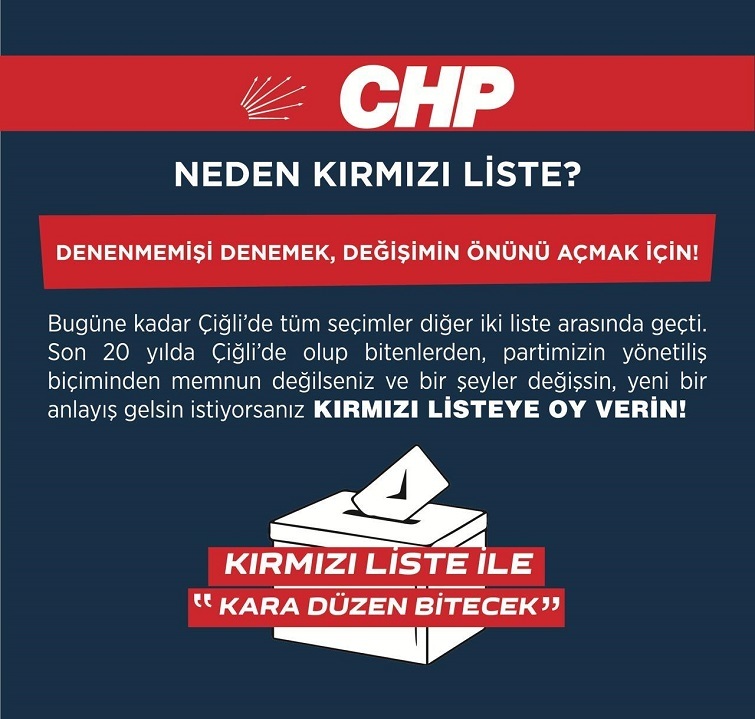 CHP’li Süleyman Karadağ kimseden icazet almadan yola çıktıklarını belirterek: “Olağan kongre sürecindeyiz. 1 yıl önce yola çıktık. Listemizi hazırlamak için çalışmalar yürüttük. Son düzlükte bizimle beraber yol yürüyen bazı arkadaşlarımız iş ve meclis üyeliği vaatleriyle yoldan çıktı. Biz ilkelerimizden ödün vermeden kırmızı listeyle yolumuza devam ediyoruz.  Ataşehir Mahallesi’nde kesinlikle kırmızı listeyle seçime giriyoruz. Çalışmalarımız çok iyi gidiyor. Sadece Mavişehir bölgesindeki üyelerimizle yaptığımız toplantı çok verimli geçti. Bize çok güveniyor ve destekliyorlar. Aldığımız tepkiler ve toplantı sonrası bize attıkları mesajlar bizi yüreklendiriyor. Seçimi alacağımıza inanıyoruz. Ataşehir Mahallesinde 3 listeyle seçime giriliyor. Mavi listeyi belediye yani şu anki iktidar destekliyor. Beyaz listeyi bir önceki dönem belediye başkan yardımcılığı yapan ve 30 yıldan fazladır Çiğli siyasetinde etkili olan Ali Rıza Koçer çıkarıyor. Bu liste kendisini önce beyaz liste olarak tanıttı. Fakat gelen tepkiler ve yoğun eleştiriler sonrası Ali Rıza Koçer’i geri plana çekerek ve listenin rengini değiştirerek farklı bir algı yaratma peşindeler. Fakat aslında beyaz ile yeşil rengi arasında hiçbir fark yok. Her ne kadar algı yaratarak yeşil liste muhaliflerin listesi diye açıklasalar da; Ali Rıza Koçer tüm üyeleri tek tek arıyor. Listenin rengini değiştirdiklerini söylüyor. Tüm üyelere whatsapp üzerinden mesaj gönderiyor. Üyelerimiz bu algıya kanmayacak kadar bilinçli ve her şeyin farkında. İçeriği aynı olan listenin rengini değiştirerek kimseyi kandıramazlar. Sevdiğimiz ve saydığımız kıymetli partili arkadaşlarımız sürekli bizi arayarak “belediyeye karşı yeşil liste ile birleşin” diye baskı yapıyor. Biz de arayanlara iki liste arasında hiçbir fark olmadığını, bu dönem mavi listeyi eleştirdiğimiz tüm yanlışları geçen dönem de yeşil listenin temsilcisinin yaptığını söylüyoruz. Bizim tek amacımız ilkeli siyaset yapmak. Bugün yeşil liste ile birleşmemizi isteyenler, geçen kongrede de “yeşil listeye karşı mavi liste ile birleşmemiz lazım” diyorlardı. Büyük bir çelişki içerisindeler. Yeşil ile mavi arasında savrulup duruyorlar. Biz ise sonuçları ne olursa olsun bu iki liste ile de ilkesel baz da birleşmemizin mümkün olmadığını biliyoruz. Belediye destekli mavi listenin seçim kazanmasından bu kadar korkuyorlarsa gelip bizim listemiz olan Kırmızı listeye destek versinler. Aldığımız ilkesel kararlar doğrultusunda dürüst siyaset yapacağız. Asla eğilip bükülmeyeceğiz ve dik duracağız. Yeşil liste içerisinde de sevdiğimiz değer verdiğimiz arkadaşlarımız var. Onlara çağrımız bir önceki iktidarın arkasına sığınmasınlar. Bizim gibi zor olan yolu seçip mücadele versinler. Her ne kadar Ali Rıza Koçer’i tasvip etmesek ve birleşmeyi kabul etmesek de; O’nun emekleri ile çıkan yeşil listeyi de kendi listeleri gibi göstererek Ali Rıza Koçer’in emeğini yok saymasınlar. Biz Kırmızı liste ile seçime gireceğiz ve kazanacağımıza inanıyoruz. Cumhuriyet Halk Partisi’ne gönül veren dostlarımıza iş, aş vaadinde bulunamıyoruz. Fakat kendilerine temiz siyaset, liyakatlı bir ilçe yönetimi, kimsenin adamı olmayacak bir ilçe başkanı vadediyoruz. Gelsinler bu ilkeler etrafında bize destek versinler" dedi.
