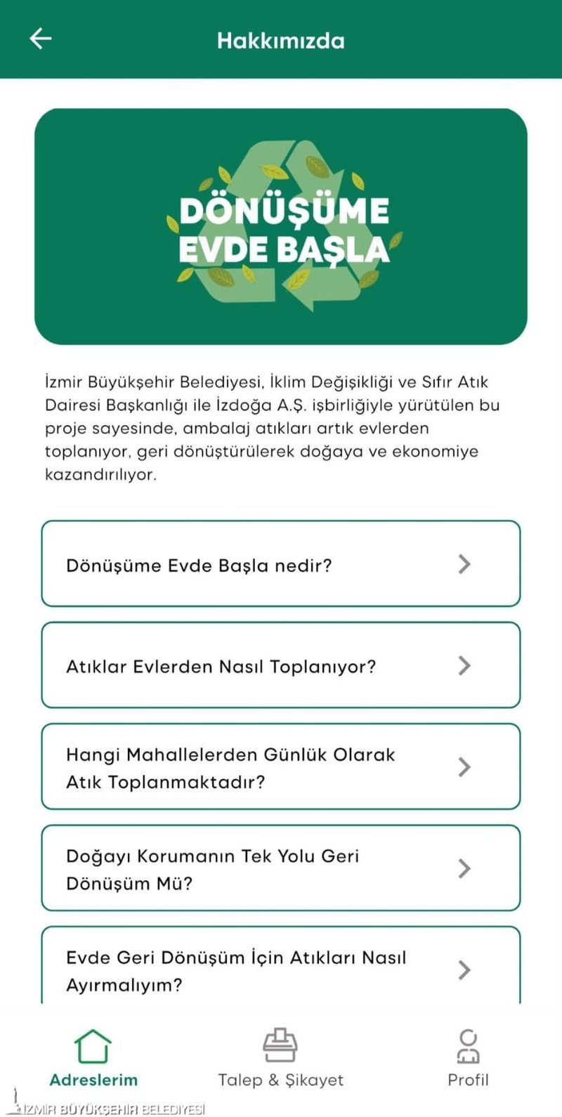 Avrupa ülkelerinin öncülük ettiği kapıdan kapıya atık toplama uygulamasını geçen aylarda İzmir’de hayata geçiren İzmir Büyükşehir Belediyesi, 8 ilçe ve 18 mahallede projeye devam ediyor. Katı atık depolama alanlarına giden ambalaj atıklarını azaltma, sıfır karbon hedefi, çevreyi koruma ve bu atıkların tekrar ekonomiye kazandırılmasını hedefleyen “Dönüşüme Evde Başla” projesinde yer alan ilçe ve mahallelerde yaşayan vatandaşlar için artık mobil uygulama da var. Uygulama ile vatandaşlar istek ve şikâyetlerini iletebiliyor. Projeyle tesis ile doğrudan iletişim sağlanması, yaşanan aksaklıklara çok daha hızlı çözüm üretilebilmesi hedefleniyor.