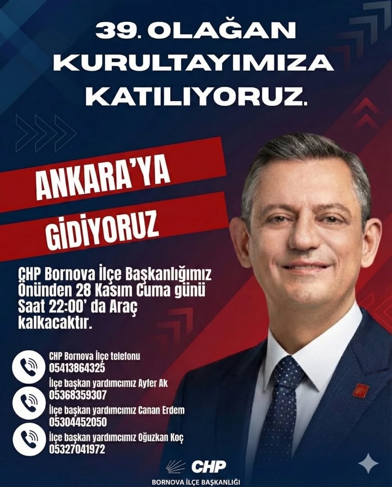 CHP Bornova İlçe Örgütü önünden 28 Kasım Cuma Günü araç kaldırılacak. Otobüsler saat: 22:00'da Ankara'ya hareket etmeye başlayacak.