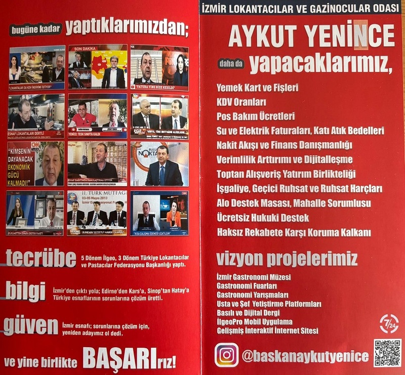 İzmir Lokantacılar ve Gazinocular Odası Başkan Adayı Aykut Yenice sektörün sorunlarından bahsederek: “Ben 1912’de Selanik’ten İzmir’e göç etmiş bir ailenin lokantacılık sektöründe 3. Kuşak temsilcisiyim. 2002 yılında İzmir Lokantacılar Odası başkanlığına seçildim. 20 yıl bu görevi sürdürdüm. Türkiye genelinde odaların başkanlığını yaptım. Biz kendimizi yaşadığımız kente katkı koyan insanlar olarak görüyoruz. Sektör her geçen gün daha sıkıntılı hale geliyor. Pandemi bizi etkiledi. İstanbul’da yaşanan zehirlenme olayı da etkiledi. Çok ağır eleştirilerle karşı karşıya kaldık. Ama olayın aslı farklı çıktı. Sektörün göz önünde olması bizi etkiliyor. Kayıt dışı ve haksız rekabetle uğraşıyoruz. Pos cihazlarından alınan paylarda sorunların başında geliyor. Şuandaki oda temsilcilerinin bu sorunları çözebileceğine inanmadığımız için tekrar aday oldum” dedi.