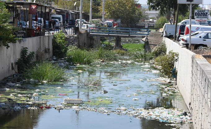 İzmir'de 1'inci Sanayi Sitesi içinden geçip daha sonra Halkapınar'dan körfeze dökülen dere, duyarsız vatandaşlar yüzünden pet şişe çöplüğüne döndü.
