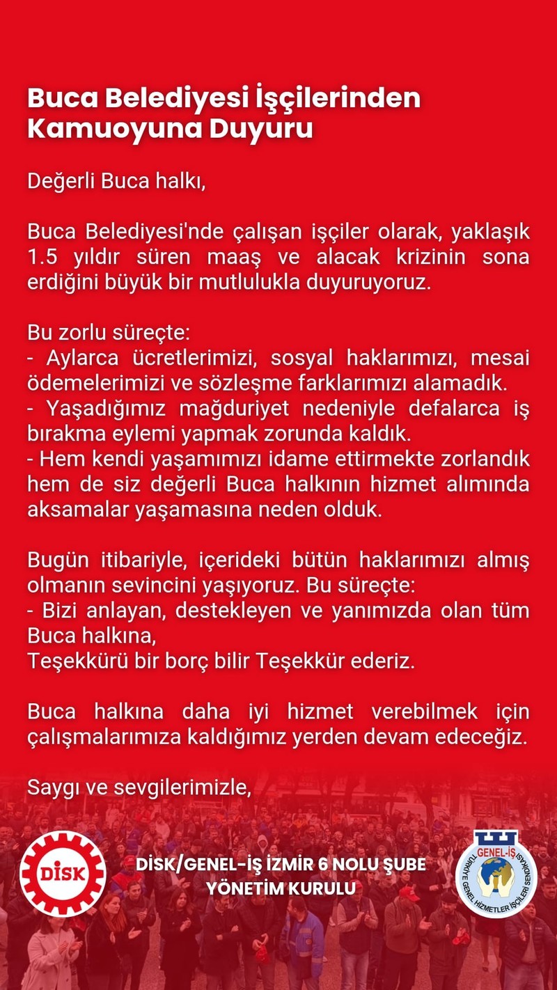 Öte yandan yayımlanan açıklamada, süreç boyunca işçilerin ücretlerini, sosyal haklarını, fazla mesai ödemelerini ve sözleşmeden kaynaklanan alacaklarını uzun süre tahsil edemediği belirtildi. Yaşanan mağduriyet nedeniyle defalarca iş bırakma eylemi yapmak zorunda kaldıklarını ifade eden işçiler, hem kendi yaşamlarını sürdürmekte zorlandıklarını hem de Buca halkının belediye hizmetlerinden yararlanmasında aksamalar yaşandığını vurguladı.