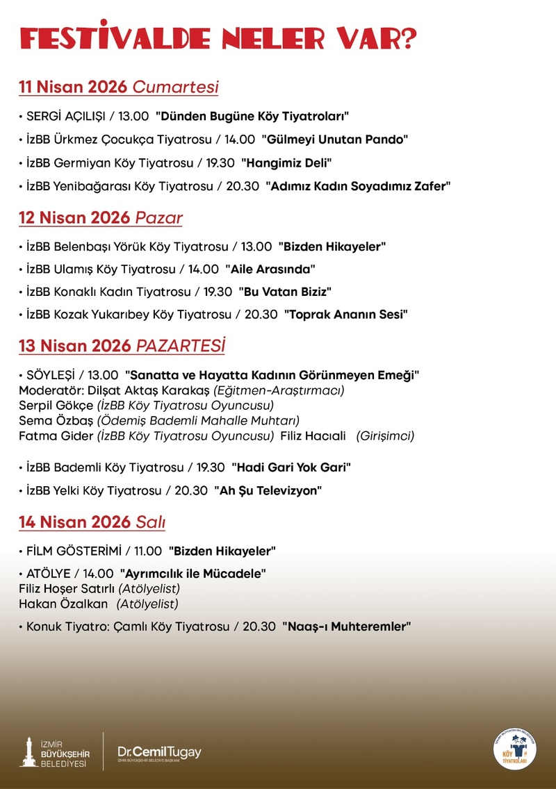 Festival programı 11 Nisan Cumartesi saat 13.00’te “Dünden Bugüne Köy Tiyatroları” sergisinin açılışıyla başlayacak. Aynı gün saat 14.00’te Ürkmez Çocukça Tiyatrosu “Gülmeyi Unutan Pando” adlı oyununu sahneleyecek, saat 19.30’da Çeşme Germiyan Köy Tiyatrosu “Hangimiz Deli” ile izleyici karşısına çıkacak ve saat 20.30’da Foça Yenibağarası Köy Tiyatrosu “Adımız Kadın Soyadımız Zafer” oyununu sergileyecek.