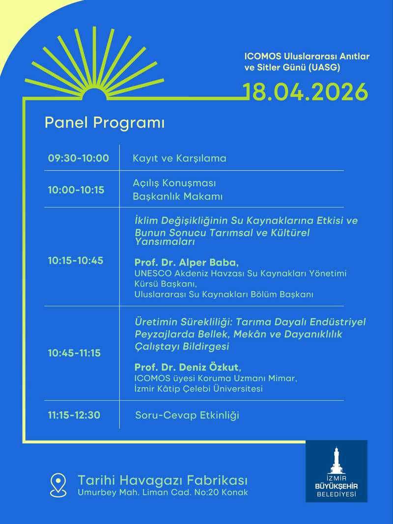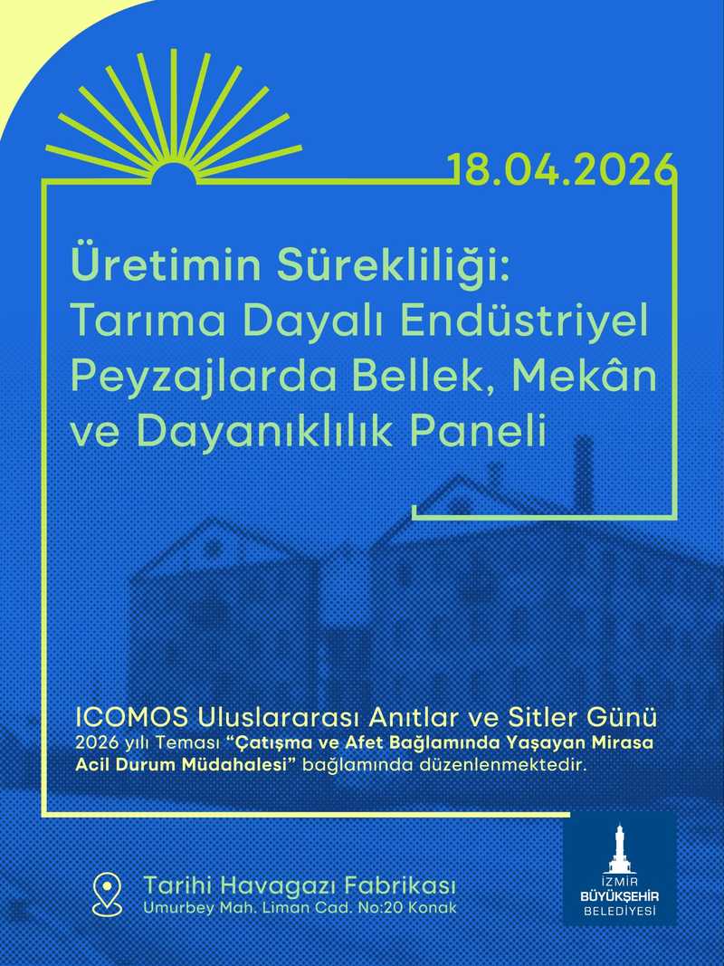 İzmir Büyükşehir Belediyesi yürütücülüğünde 17-18 Nisan tarihleri arasında Tarihi Havagazı Fabrikası yerleşkesinde “Üretimin Sürekliliği: Tarıma Dayalı Endüstriyel Peyzajlarda Bellek, Mekân ve Dayanıklılık Çalıştayı ve Paneli” düzenlenecek. “Uluslararası Anıtlar ve Sitler Günü” kapsamında düzenlenecek etkinlik, Uluslararası Anıtlar ve Sitler Konseyi’nin (ICOMOS) 2026 yılı “Çatışma ve Afet Bağlamında Yaşayan Mirasa Acil Durum Müdahalesi” teması çerçevesinde gerçekleştirilecek.