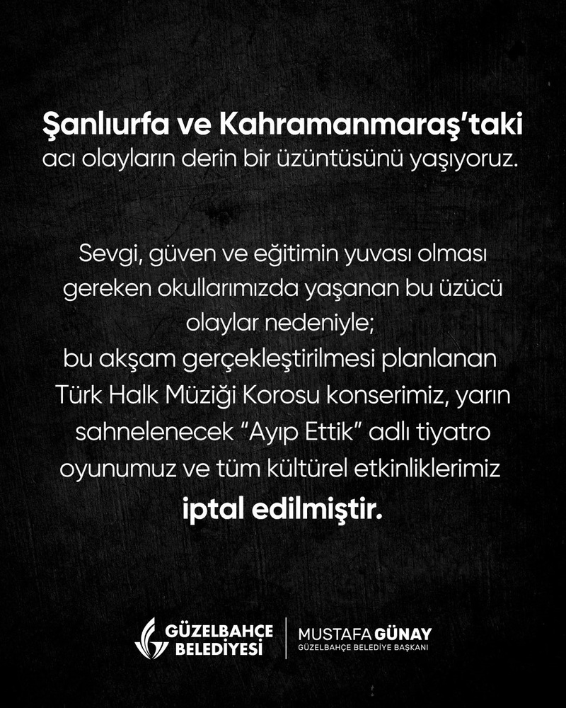 İptal kararlarını sosyal medyadan duyuran Güzelbahçe Belediye Başkanı Mustafa Günay: "Şanlıurfa ve Kahramanmaraş’taki acı olayların derin bir üzüntüsünü yaşıyoruz. Sevgi, güven ve eğitimin yuvası olması gereken okullarımızda yaşanan bu üzücü olaylar nedeniyle; bu akşam gerçekleştirilmesi planlanan Türk Halk Müziği Korosu konserimiz, yarın sahnelenecek “Ayıp Ettik” adlı tiyatro oyunumuz ve tüm kültürel etkinliklerimiz iptal edilmiştir" dedi.