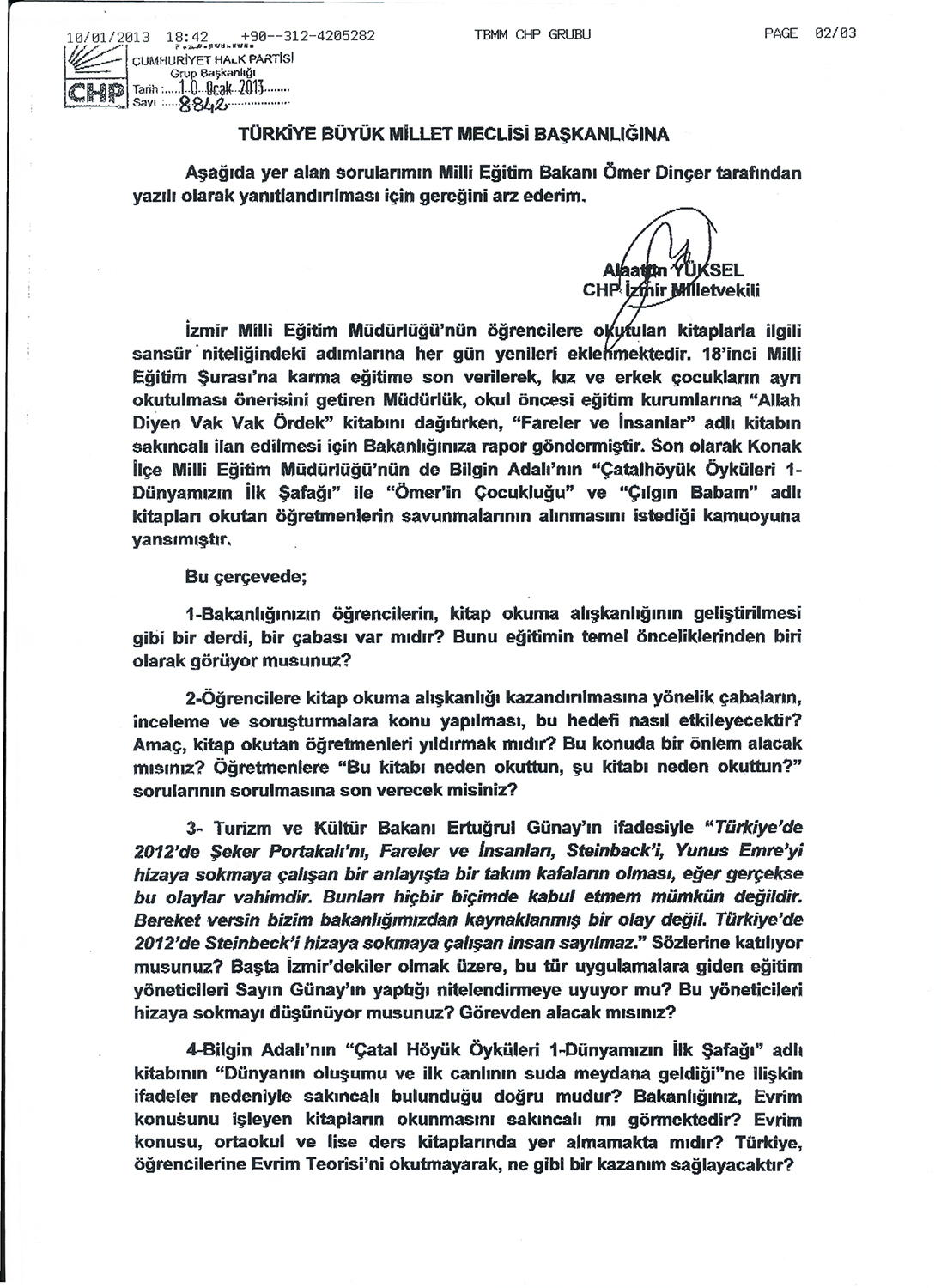 4-Bilgin Adalı’nın “Çatal Höyük Öyküleri 1-Dünyamızın İlk Şafağı” adlı kitabının “Dünyanın oluşumu ve ilk canlının suda meydana geldiği”ne ilişkin ifadeler nedeniyle sakıncalı bulunduğu doğru mudur? Bakanlığınız, Evrim konusunu işleyen kitapların okunmasını sakıncalı mı görmektedir? Evrim konusu, ortaokul ve lise ders kitaplarında yer almamakta mıdır? Türkiye, öğrencilerine Evrim Teorisi’ni okutmayarak, ne gibi bir kazanım sağlayacaktır?