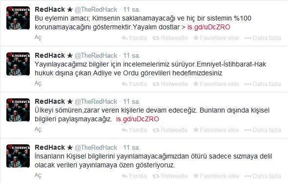 Yaptıkları eylemin amacının kimsenin saklanamayacağı ve hiçbir sistemin yüzde 100 korunamayacağını göstermek olduğunu belirten RedHack, “İnsanların kişisel bilgilerini yayınlamayacağımızdan ötürü sadece sızmaya delil olacak verileri yayınlamaya özen gösteriyoruz. Ülkeyi sömüren, zarar veren kişilerle devam edeceğiz. Bunların dışında kişisel bilgileri paylaşmayacağız. Yayınlayacağımız bilgiler için incelemelerimiz sürüyor. Emniyet-İstihbarat-Hak hukuk dışına çıkan Adliye ve Ordu görevlileri hedefimizdesiniz.”