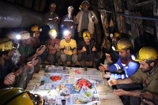İşçiler, işverinin verdiği yiyeceklerin yanında evlerinden getirdikleri domates, biber, salatalık, peynir, zeytin, karpuz, meyve suyu ve ekmeği, kömür karası içindeki elleriyle yedi. İşçiler, yemek ardından ölen maden şehitleri ve kazasız bir Ramazan ayı geçirmek için dua etti.