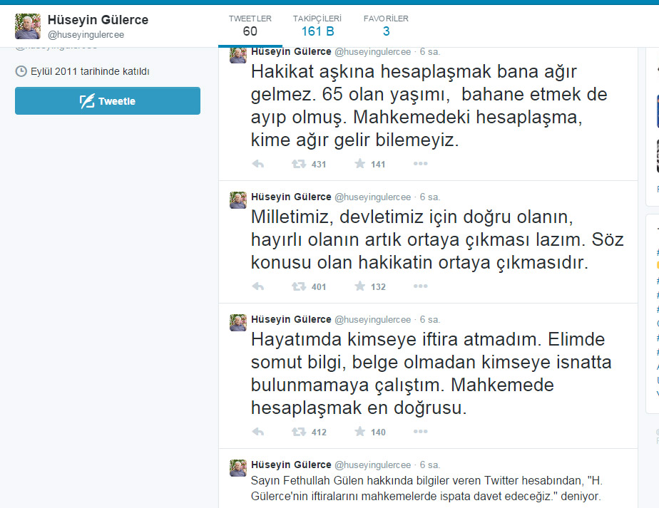 Fethullah Gülen'a ait olduğu öne sürülen @fgulen adlı Twitter hesabından bugün atılan tweet'te Hüseyin Gülerce'ye yönelik olarak, "H.Gülerce'nin iftiralarını mahkemelerde ispata davet edeceğiz. Bu yaşa gelmiş biriyle mahkemede hesaplaşmak çok ağır gelse de!" ifadeleri kullanılmıştı.