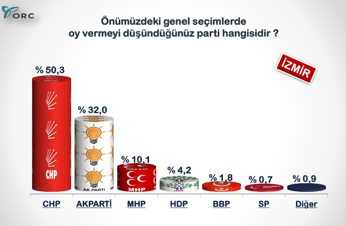 İzmir'de partilerin oy dağılımında CHP yüzde 50.3 oranıyla önde.